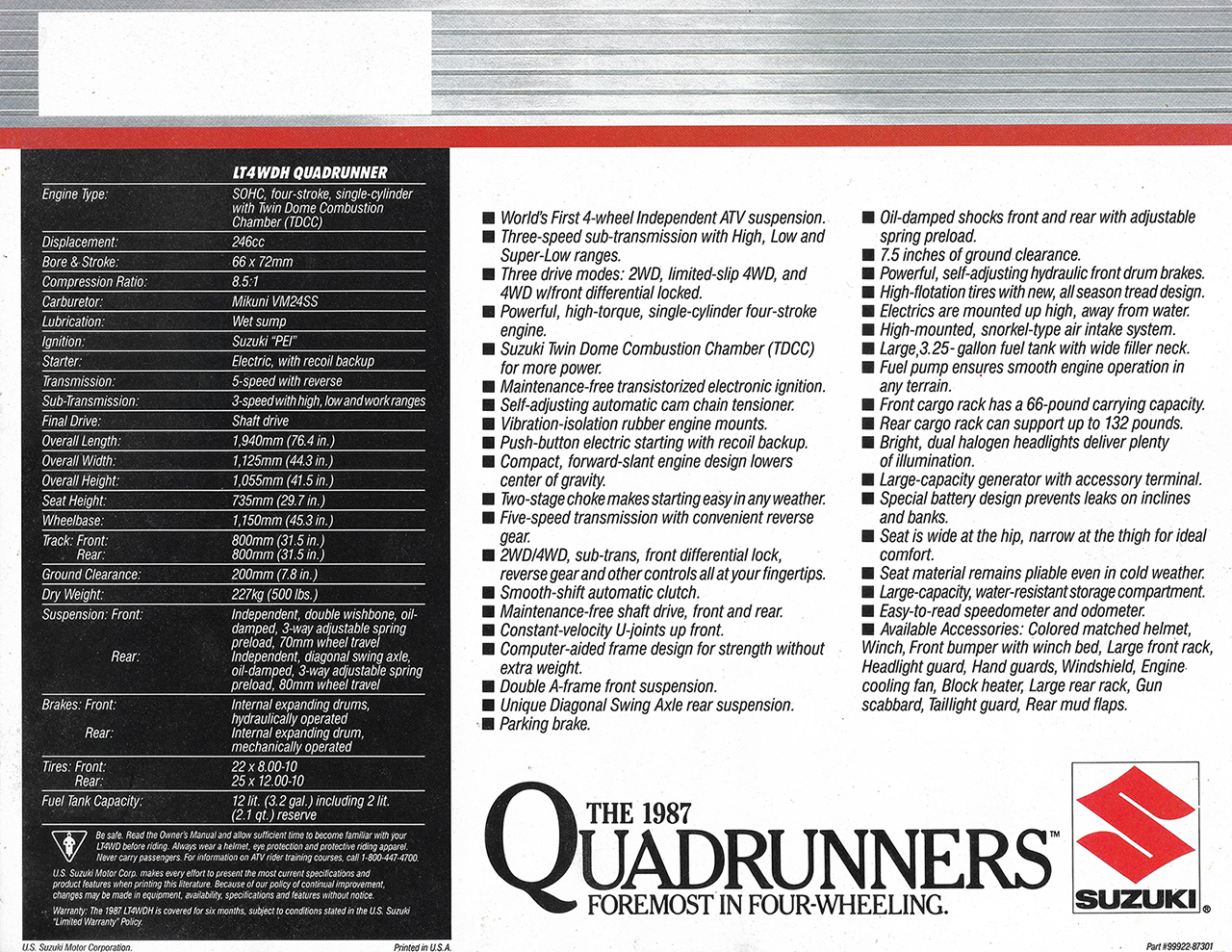Suzuki lived up to the ads. I purchased NOS brochures and the official Suzuki Service Manual off eBay a few years ago and scanned them in an attempt to preserve history. The ad at the top was the first year: 1987 model pictures. Square axle nut boots (cone shaped all other years ), silver skid plate up front (black all other years), and the only year with the flip up/down front and rear racks. The LT-4WD had a retail price of $3298.00.